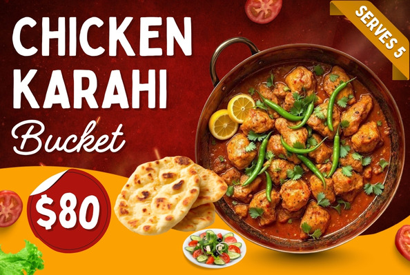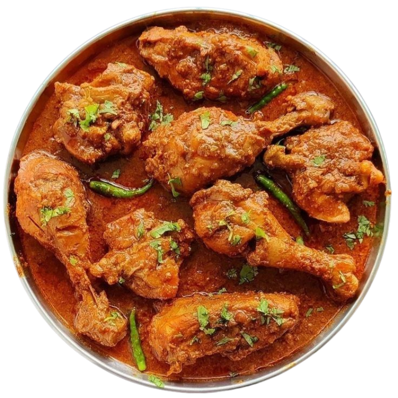 Chicken KarahiWhole fresh chicken cooked with Roma tomatoes, Thai green chilli, and ginger. Served with fresh salad, traditional raita, and fresh roti.