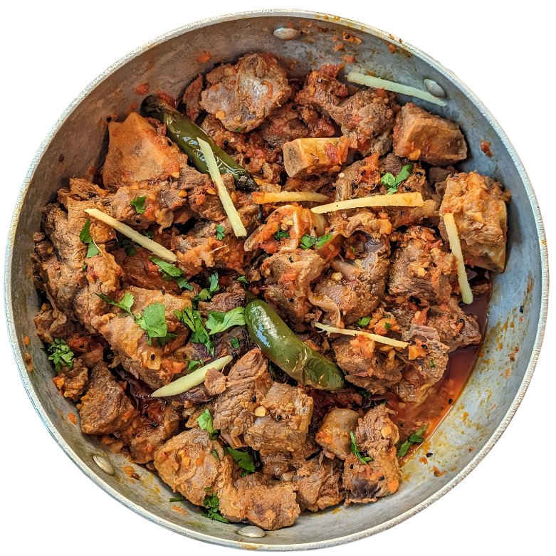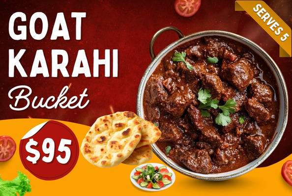 Goat KarahiGoat leg and shoulder cooked with Roma tomatoes, Thai green chilli, and traditional spices. Served with fresh salad, raita, and fresh roti.