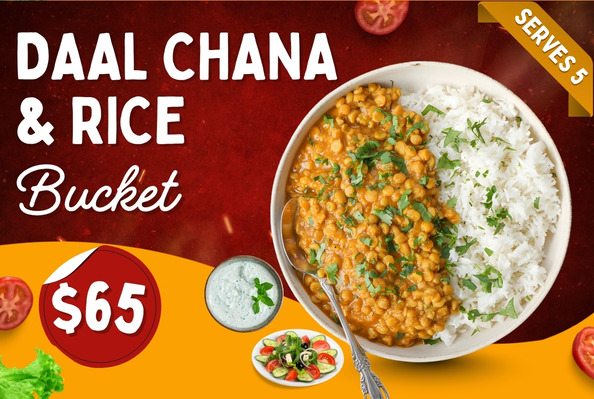 Daal Chana with White RiceTraditional Pakistani lentils served with white rice, salad, raita, Shami Kebab, and soft drink.