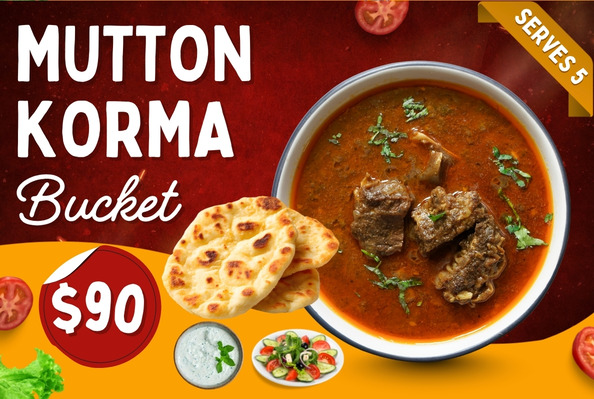 Mutton KormaFresh goat leg and shoulder cooked in traditional spices with green chilli and onions. Served with fresh salad, raita, fresh roti, and 1.25L soft drink.